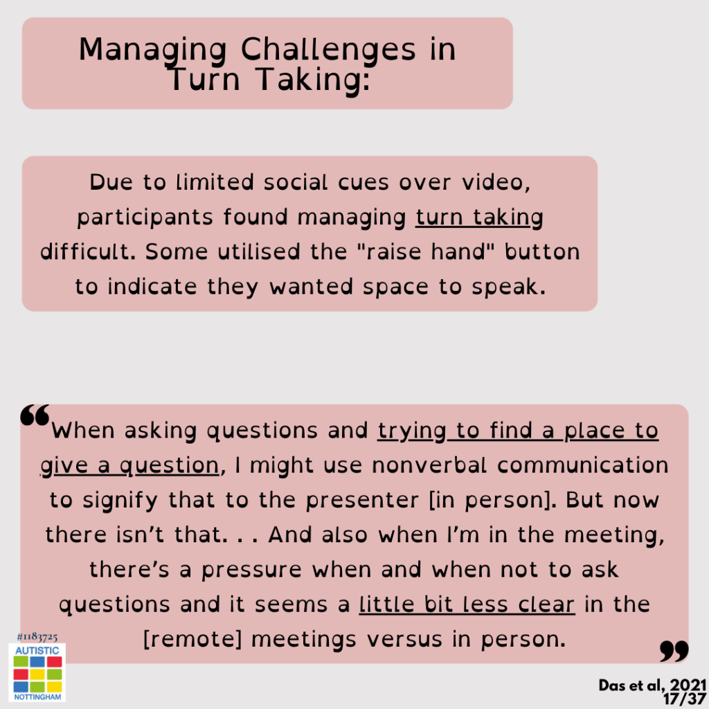 Due to limited social cues over video, participants found managing turn taking difficult. Some utilised the “raise hand” button to indicate they wanted space to speak.