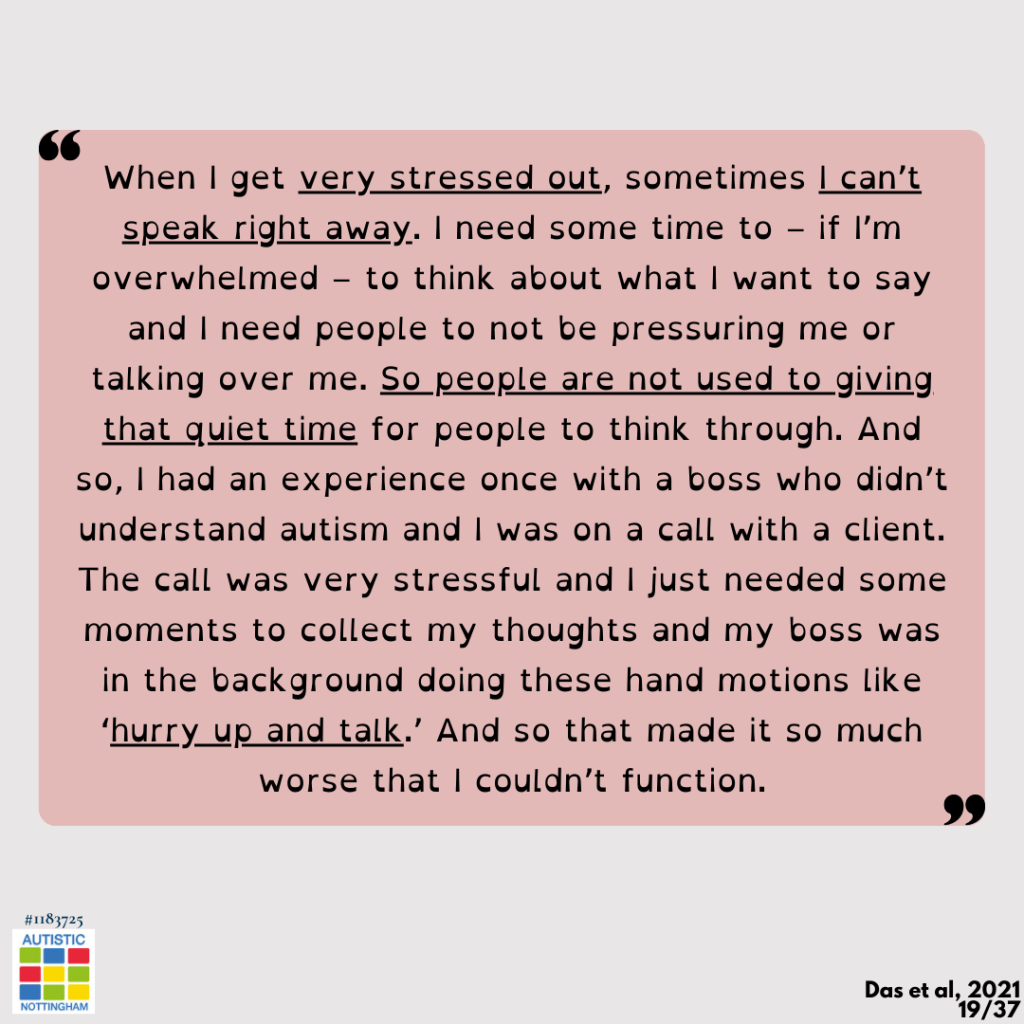 “When I get very stressed out, sometimes I can’t speak right away. I need some time to – if I’m overwhelmed – to think about what I want to say and I need people to not be pressuring me or talking over me. So people are not used to giving that quiet time for people to think through. And so, I had an experience once with a boss who didn’t understand autism and I was on a call with a client. The call was very stressful and I just needed some moments to collect my thoughts and my boss was in the background doing these hand motions like ‘hurry up and talk.’ And so that made it so much worse that I couldn’t function.”
