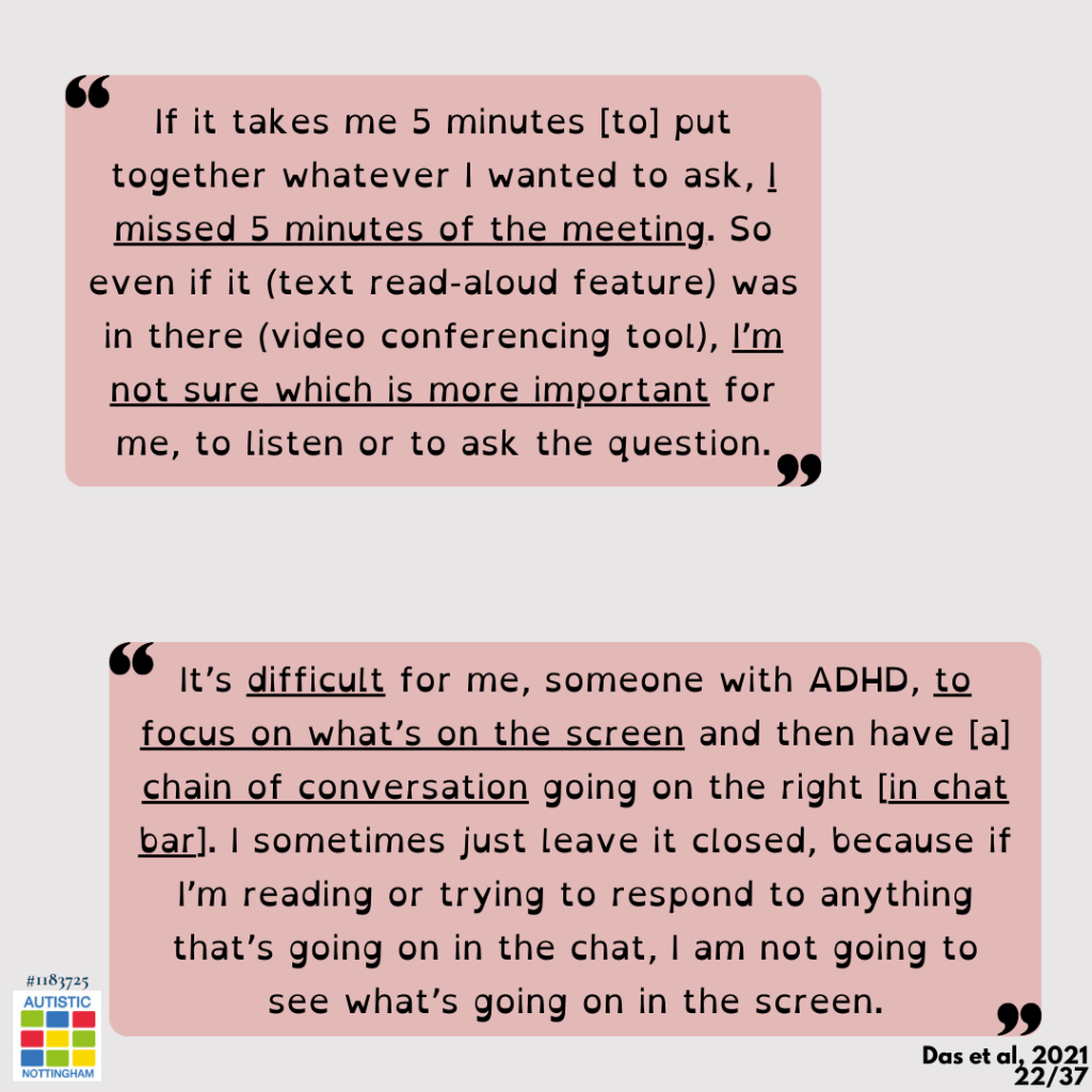 “It’s difficult for me, someone with ADHD, to focus on what’s on the screen and then have [a] chain of conversation going on the right [in chat bar]. I sometimes just leave it closed, because if I’m reading or trying to respond to anything that’s going on in the chat, I am not going to see what’s going on in the screen.”