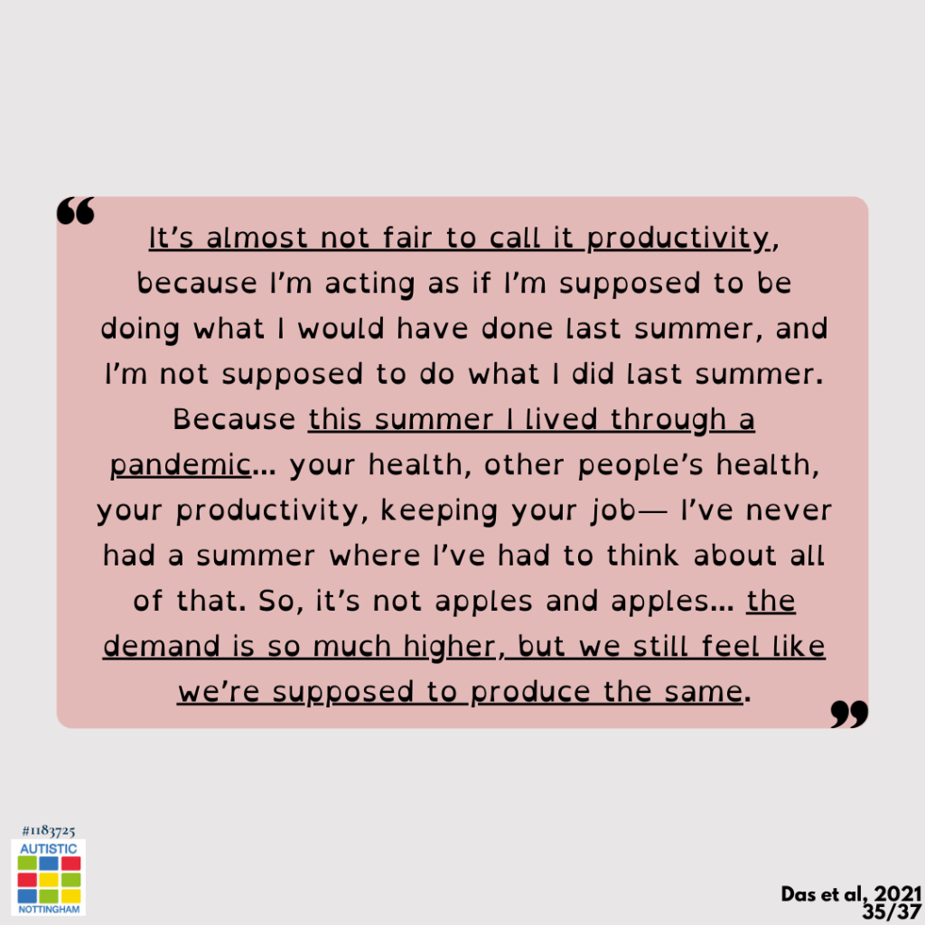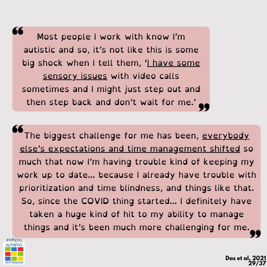 “The biggest challenge for me has been, everybody else’s expectations and time management shifted so much that now I’m having trouble kind of keeping my work up to date… because I already have trouble with prioritization and time blindness, and things like that. So, since the COVID thing started… I definitely have taken a huge kind of hit to my ability to manage things and it’s been much more challenging for me.”