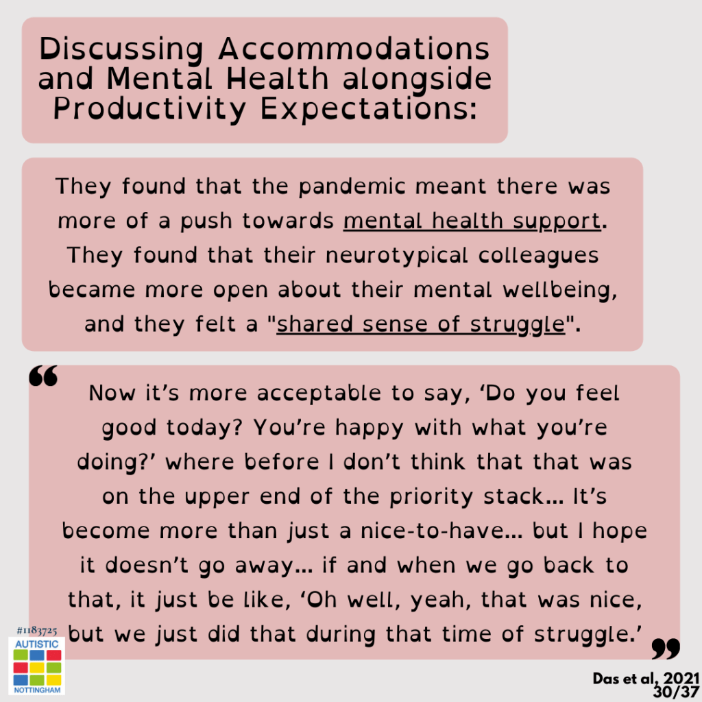 They found that the pandemic meant there was more of a push towards mental health support. They found that their neurotypical colleagues became more open about their mental wellbeing, and they felt a “shared sense of struggle”.