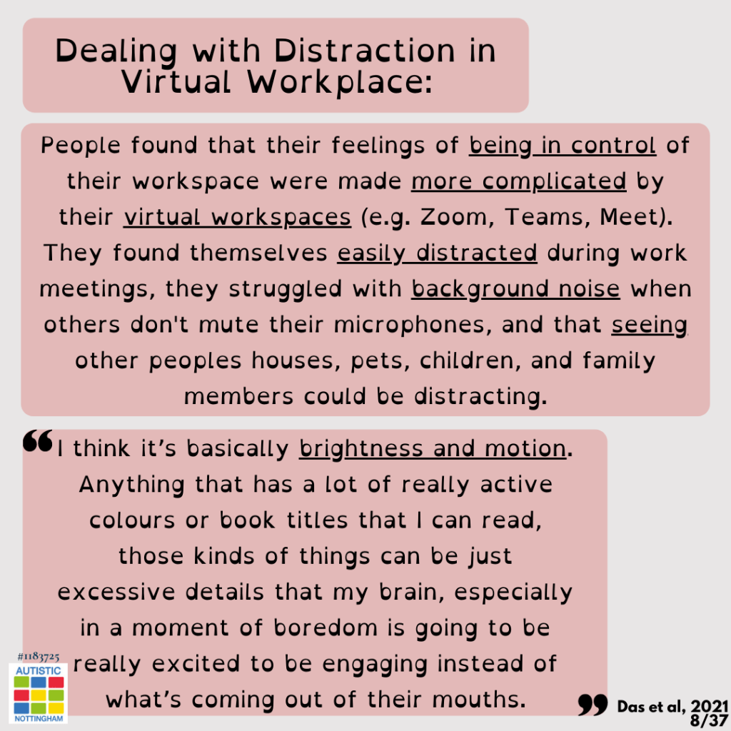 Many found that they had an easier time controlling sensory stimuli & distractions while working from home, and appreciated not having other people in their workspaces. However, those who did not have space for a home office, or who had family in their homes, found remote working difficult. They also found it hard having their non-work interests in their presence while trying to work.