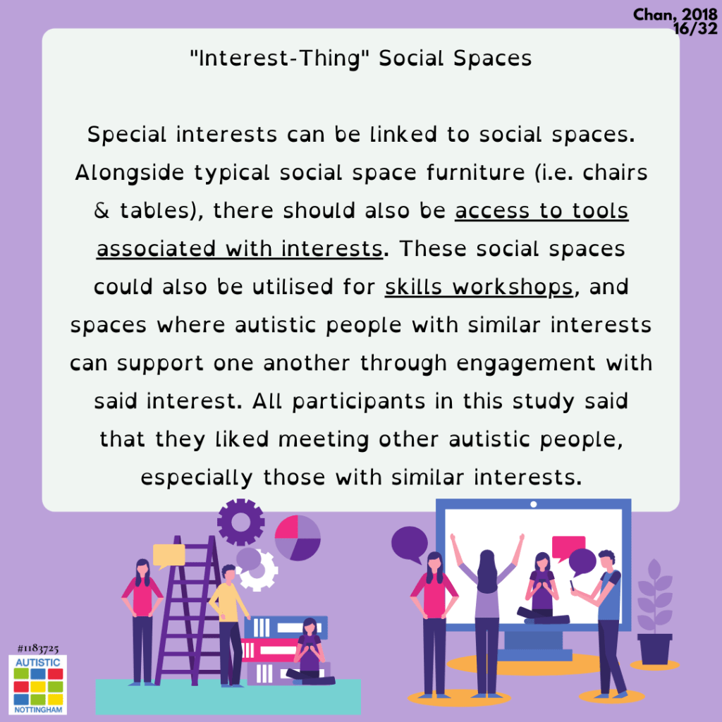 Special interests can be linked to social spaces. Alongside typical social space furniture (i.e. chairs & tables), there should also be access to tools associated with interests. These social spaces could also be utilised for skills workshops, and spaces where autistic people with similar interests can support one another through engagement with said interest. All participants in this study said that they liked meeting other autistic people, especially those with similar interests.