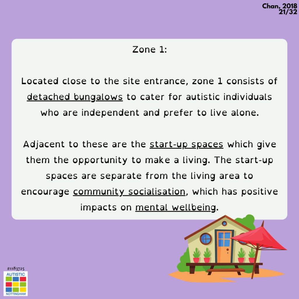 Located close to the site entrance, zone 1 consists of detached bungalows to cater for autistic individuals who are independent and prefer to live alone.