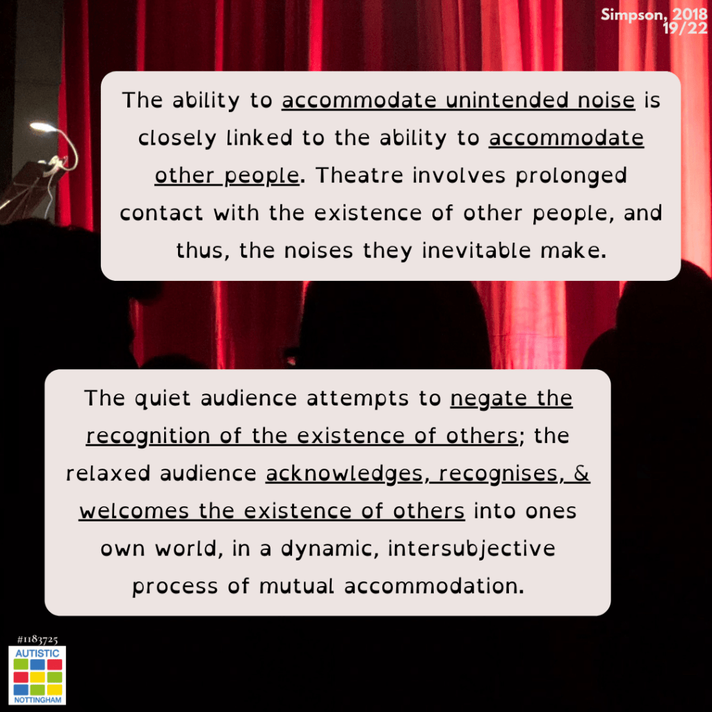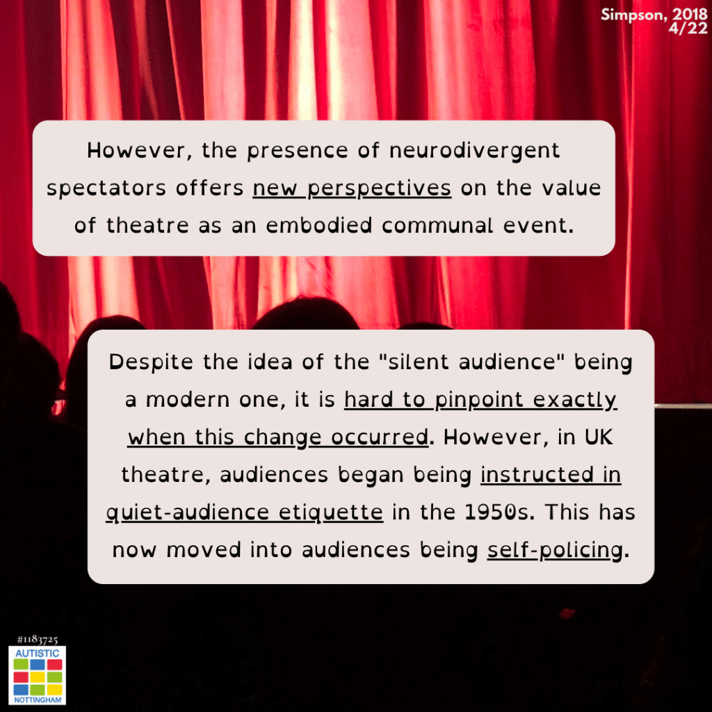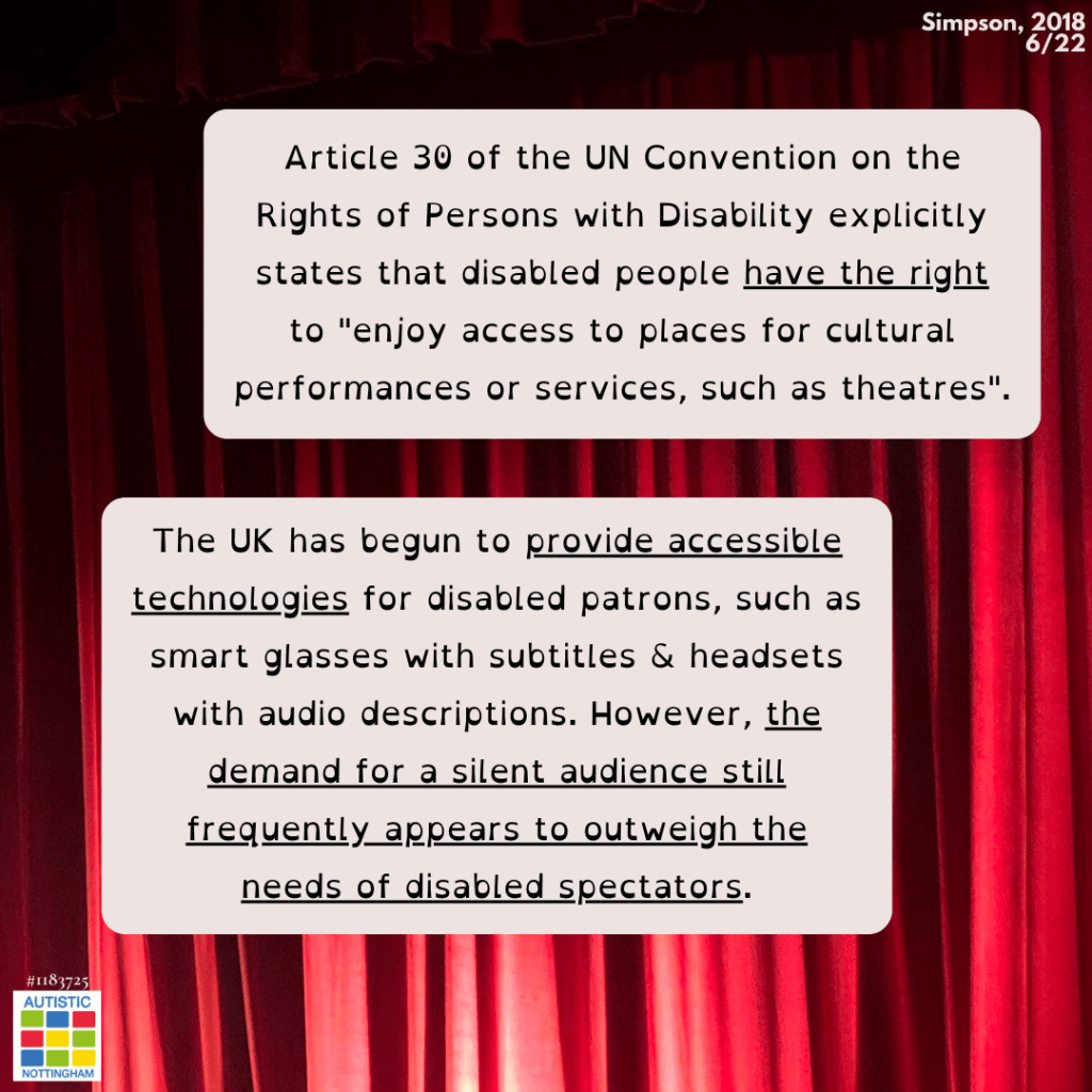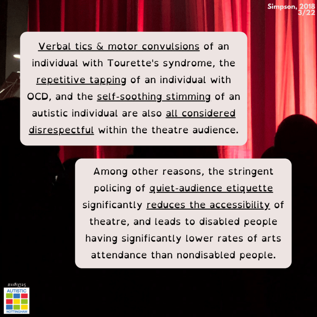 Among other reasons, the stringent policing of quiet-audience etiquette significantly reduces the accessibility of theatre, and leads to disabled people having significantly lower rates of arts attendance than nondisabled people.