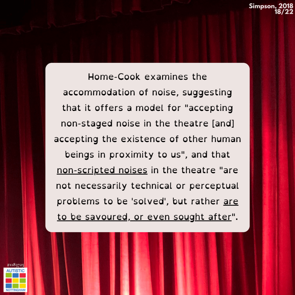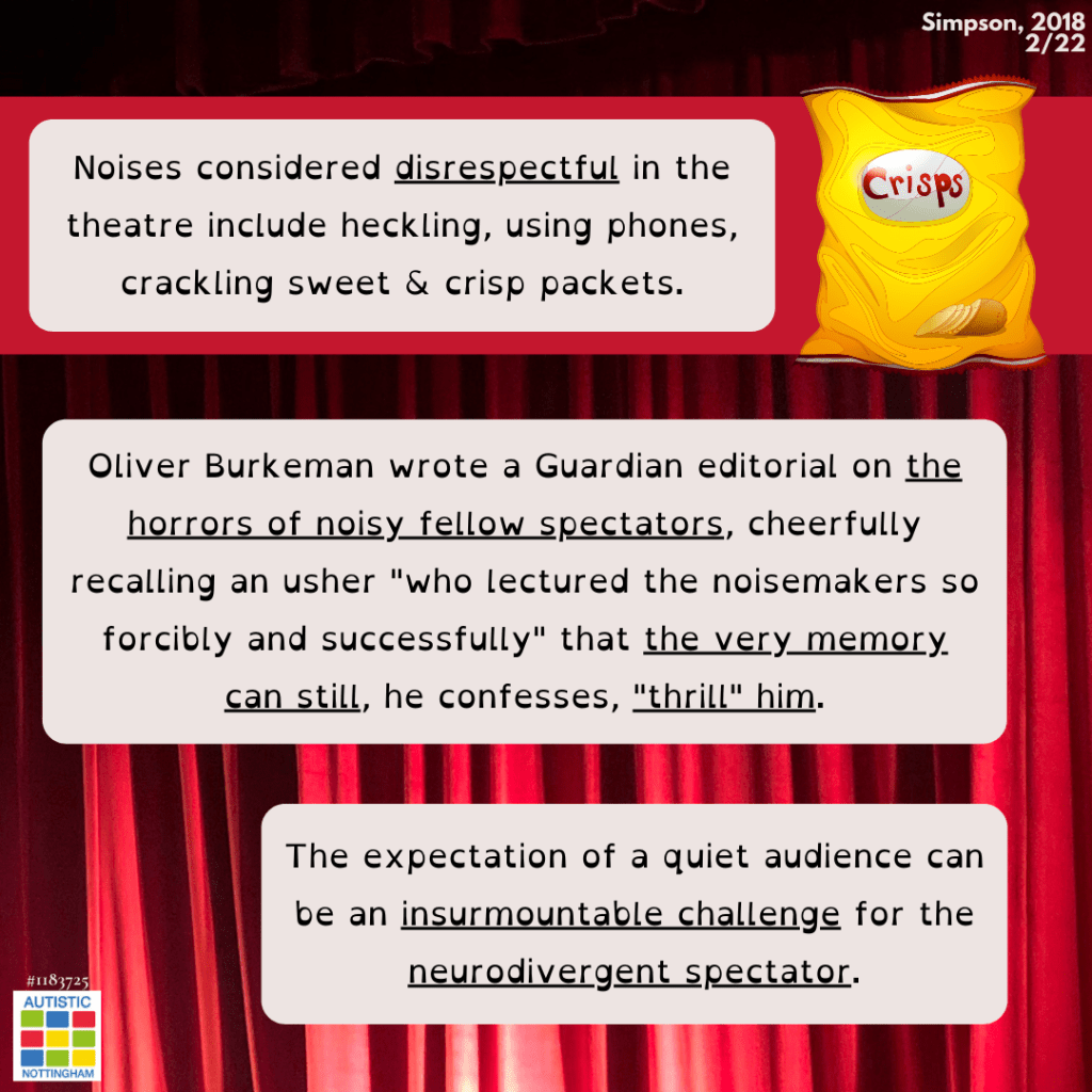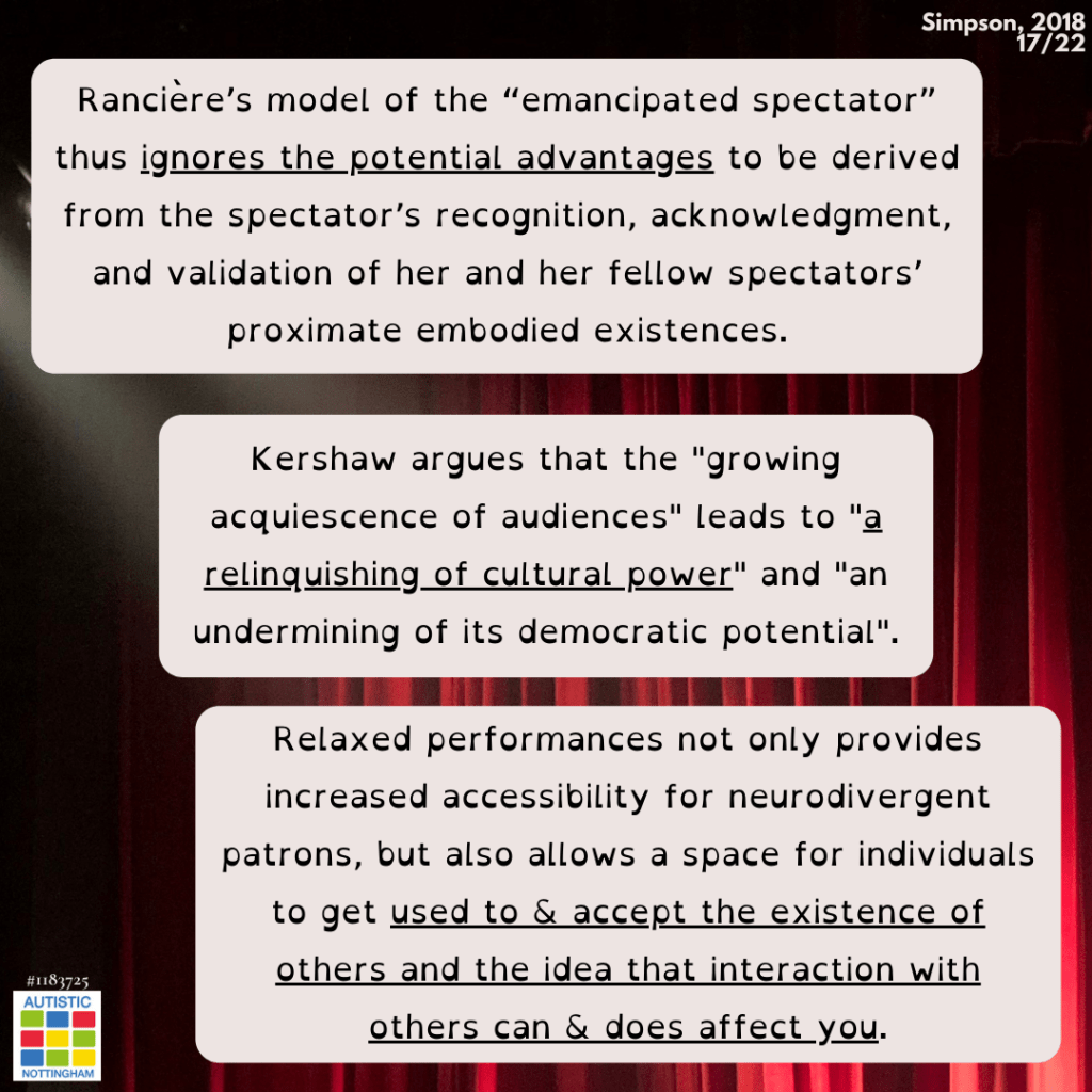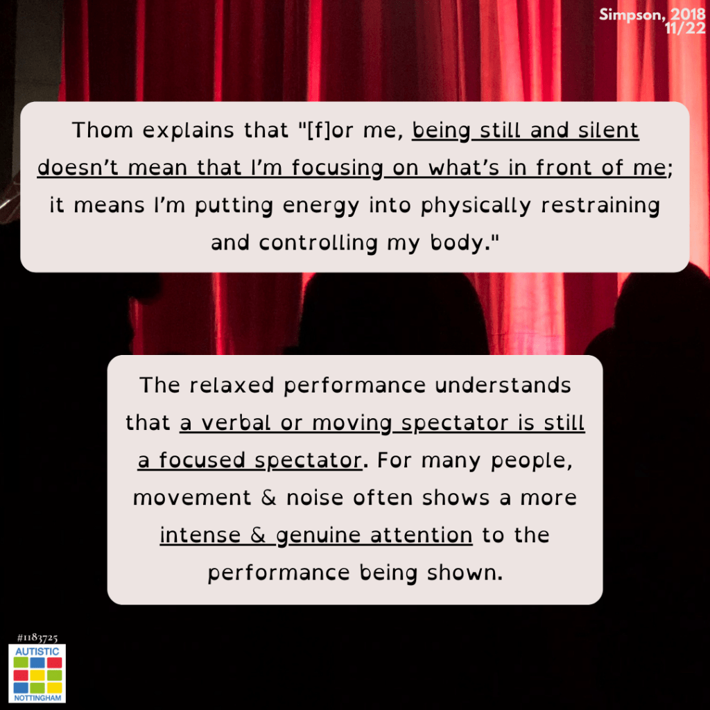 Among other reasons, the stringent policing of quiet-audience etiquette significantly reduces the accessibility of theatre, and leads to disabled people having significantly lower rates of arts attendance than nondisabled people.