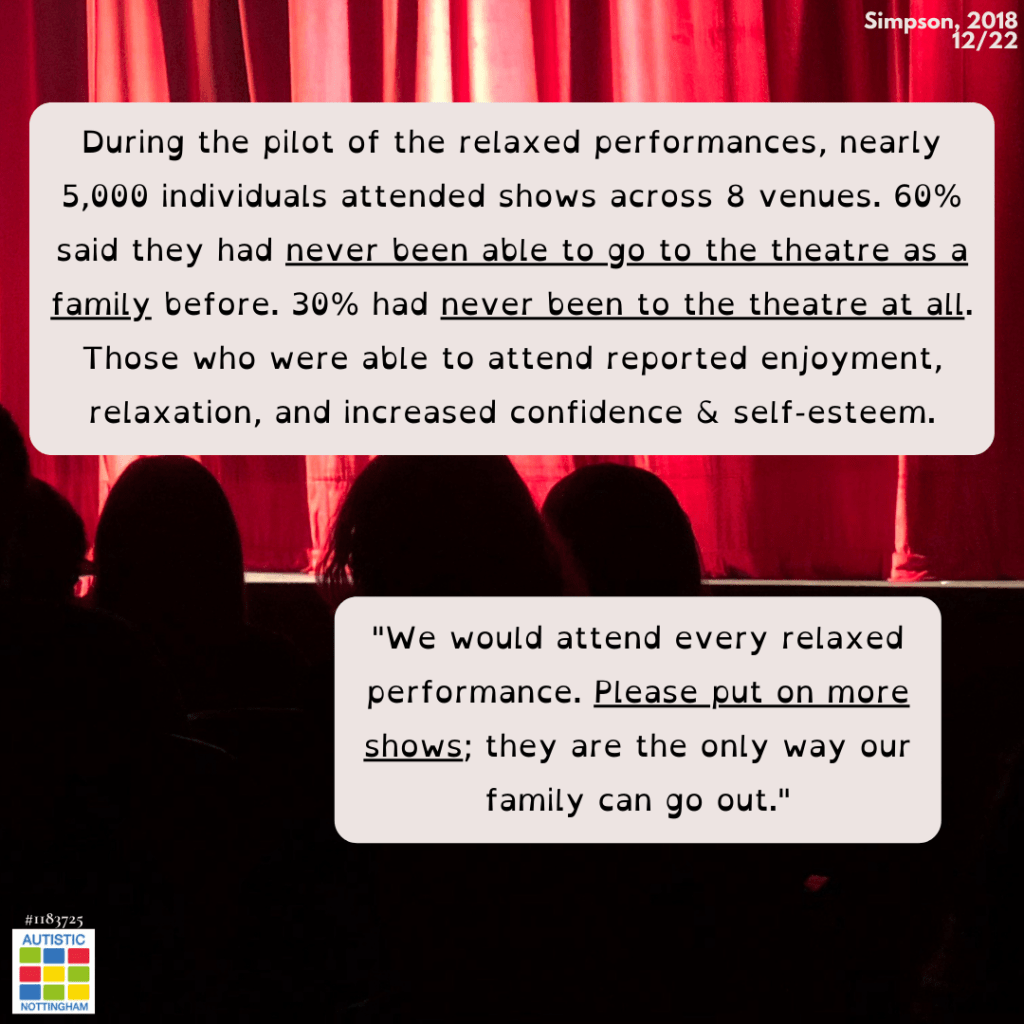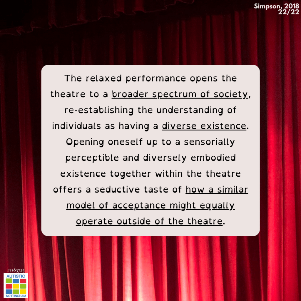 Relaxed performances not only provides increased accessibility for neurodivergent patrons, but also allows a space for individuals to get used to & accept the existence of others and the idea that interaction with others can & does affect you.