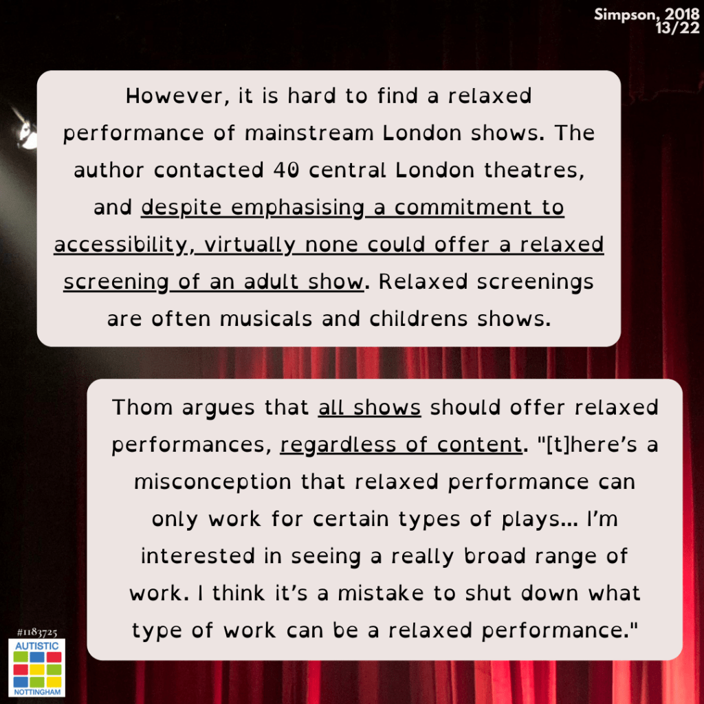 However, it is hard to find a relaxed performance of mainstream London shows. The author contacted 40 central London theatres, and despite emphasising a commitment to accessibility, virtually none could offer a relaxed screening of an adult show. Relaxed screenings are often musicals and childrens shows.