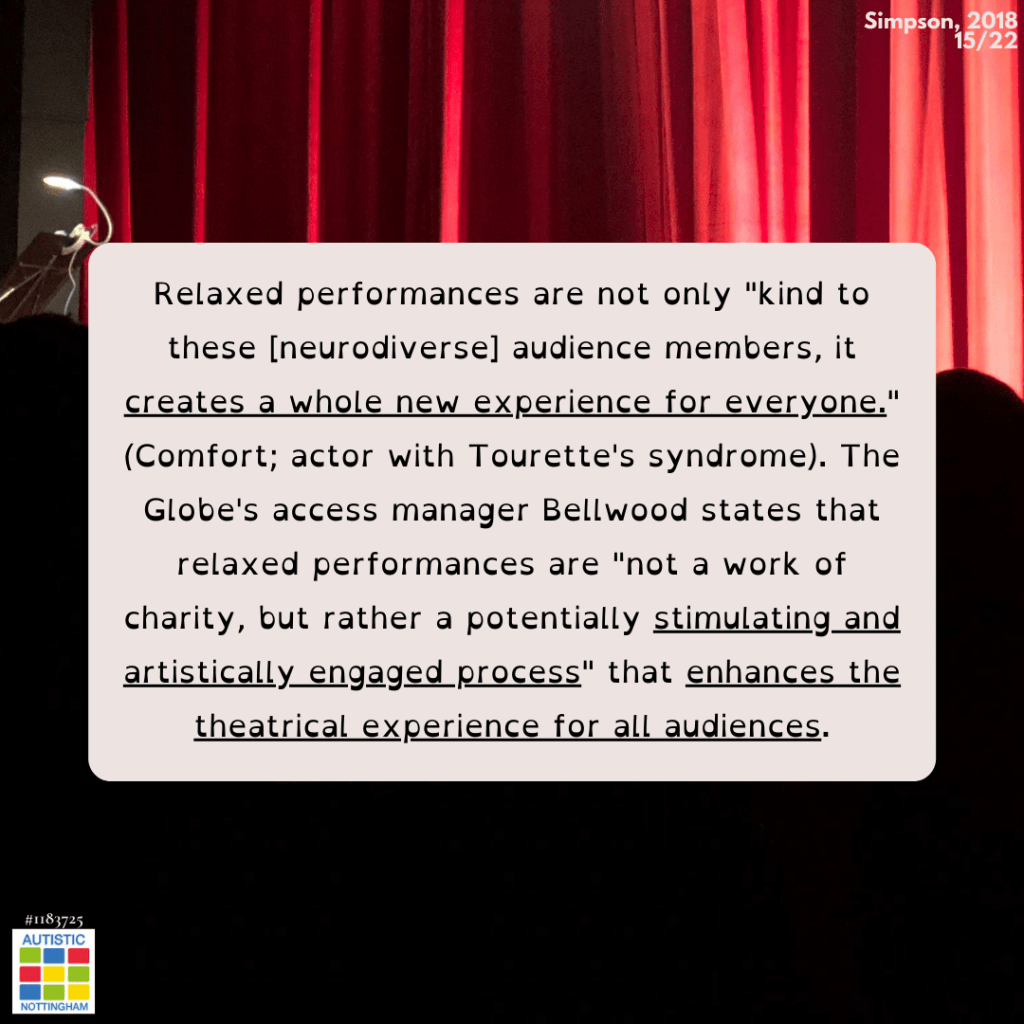 Relaxed performances are not only “kind to these [neurodiverse] audience members, it creates a whole new experience for everyone.” (Comfort; actor with Tourette’s syndrome). The Globe’s access manager Bellwood states that relaxed performances are “not a work of charity, but rather a potentially stimulating and artistically engaged process” that enhances the theatrical experience for all audiences.