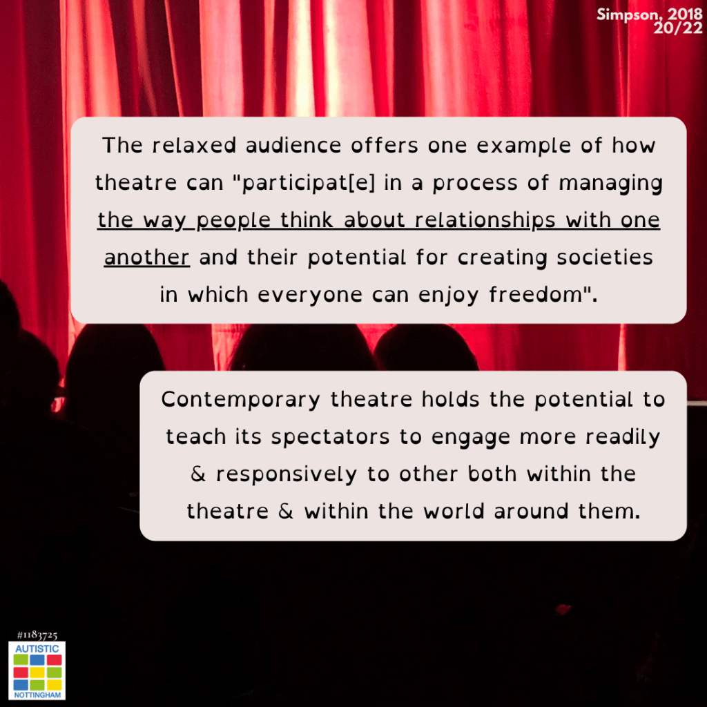 The relaxed audience offers one example of how theatre can “participat[e] in a process of managing the way people think about relationships with one another and their potential for creating societies in which everyone can enjoy freedom”.