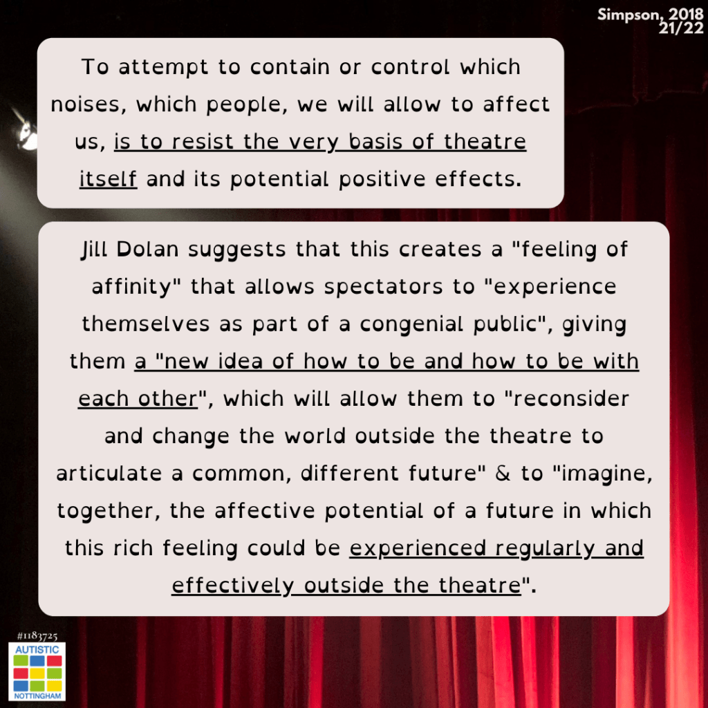 However, the presence of neurodivergent spectators offers new perspectives on the value of theatre as an embodied communal event.
