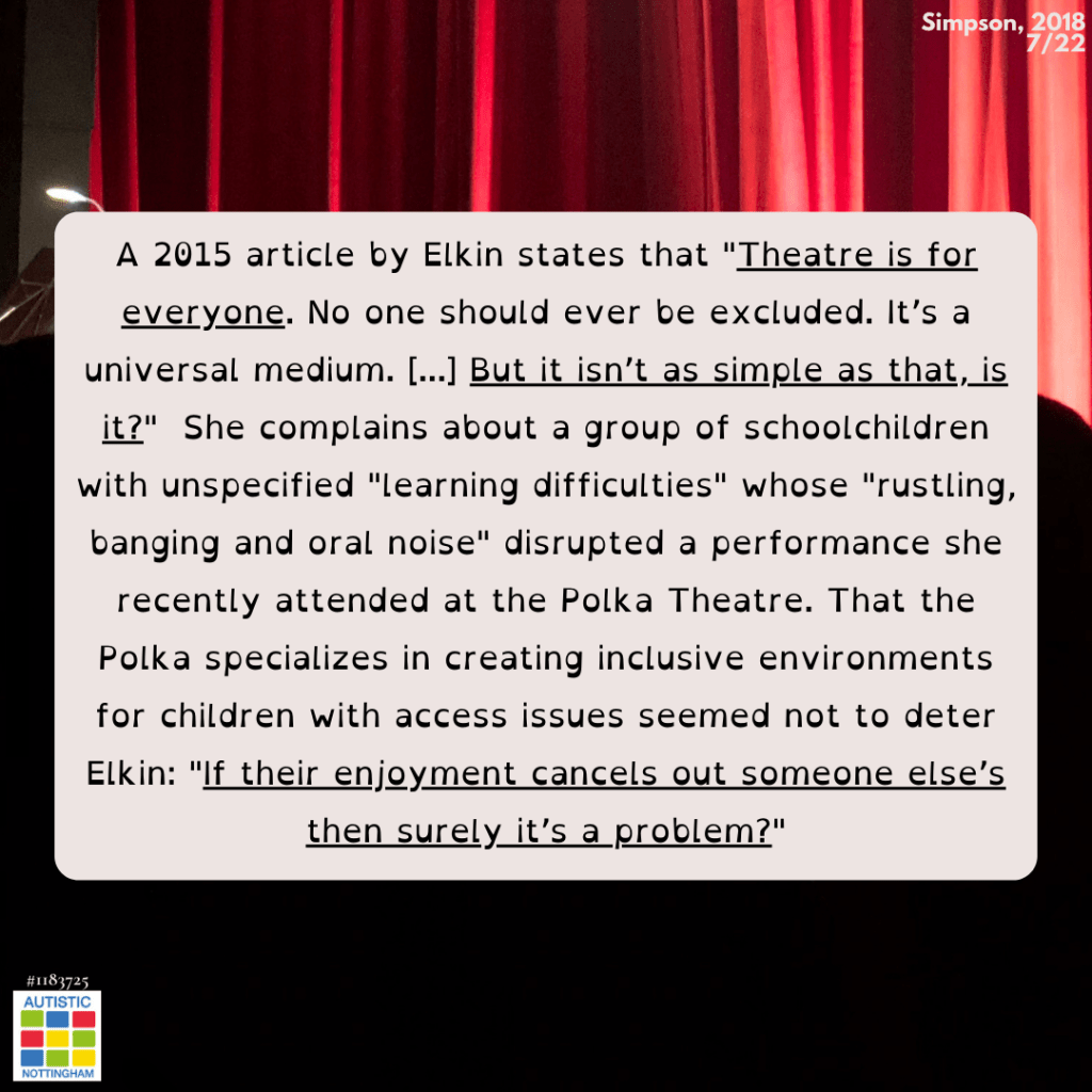 A 2015 article by Elkin states that “Theatre is for everyone. No one should ever be excluded. It’s a universal medium. […] But it isn’t as simple as that, is it?” She complains about a group of schoolchildren with unspecified “learning difficulties” whose “rustling, banging and oral noise” disrupted a performance she recently attended at the Polka Theatre. That the Polka specializes in creating inclusive environments for children with access issues seemed not to deter Elkin: “If their enjoyment cancels out someone else’s then surely it’s a problem?”