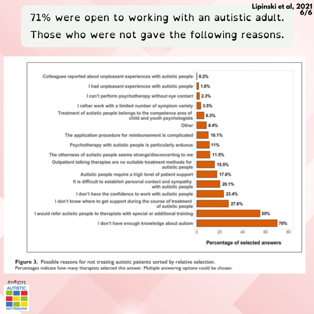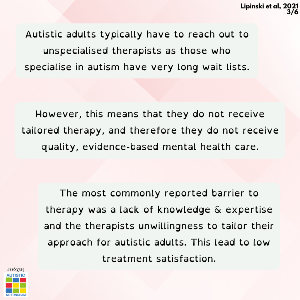 Autistic adults typically have to reach out to unspecialised therapists as those who specialise in autism have very long wait lists.