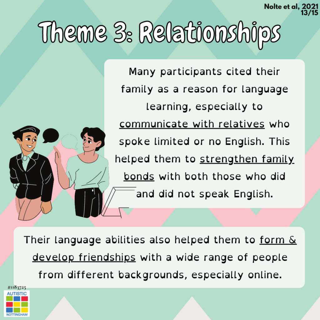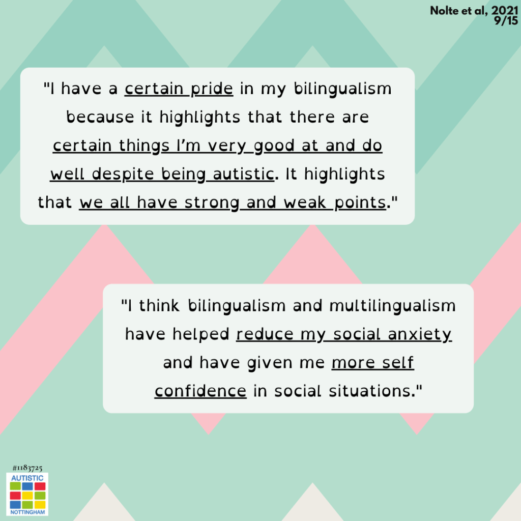They felt that learning & knowing other languages increased their social understanding, making them more comfortable in interacting with others, especially in terms of perspective-taking abilities and in becoming more aware of social patterns in communication. Many felt that autistic people may have more to benefit from multilingualism than neurotypical people.