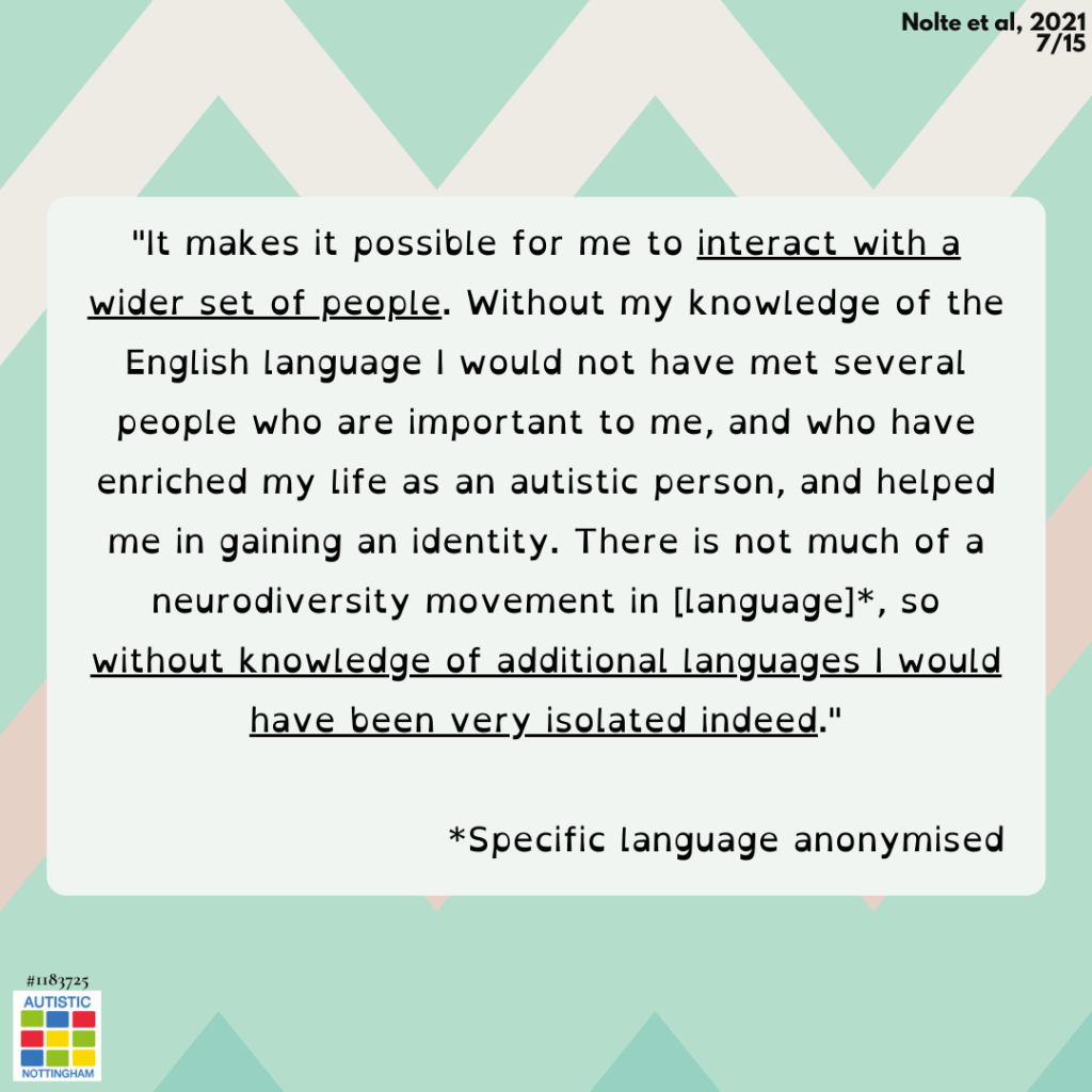 “It makes it possible for me to interact with a wider set of people. Without my knowledge of the English language I would not have met several people who are important to me, and who have enriched my life as an autistic person, and helped me in gaining an identity. There is not much of a neurodiversity movement in [language]*, so without knowledge of additional languages I would have been very isolated indeed.”