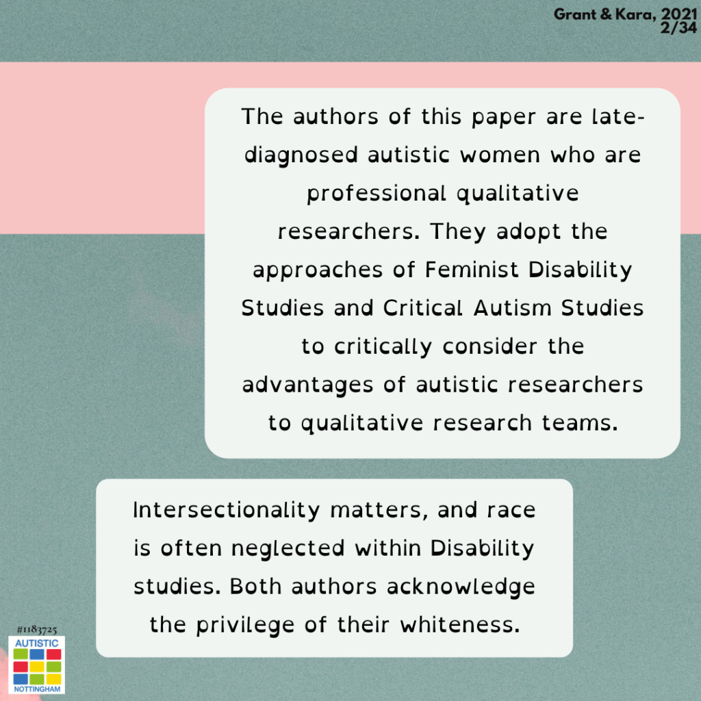 The authors of this paper are late-diagnosed autistic women who are professional qualitative researchers. They adopt the approaches of Feminist Disability Studies and Critical Autism Studies to critically consider the advantages of autistic researchers to qualitative research teams.