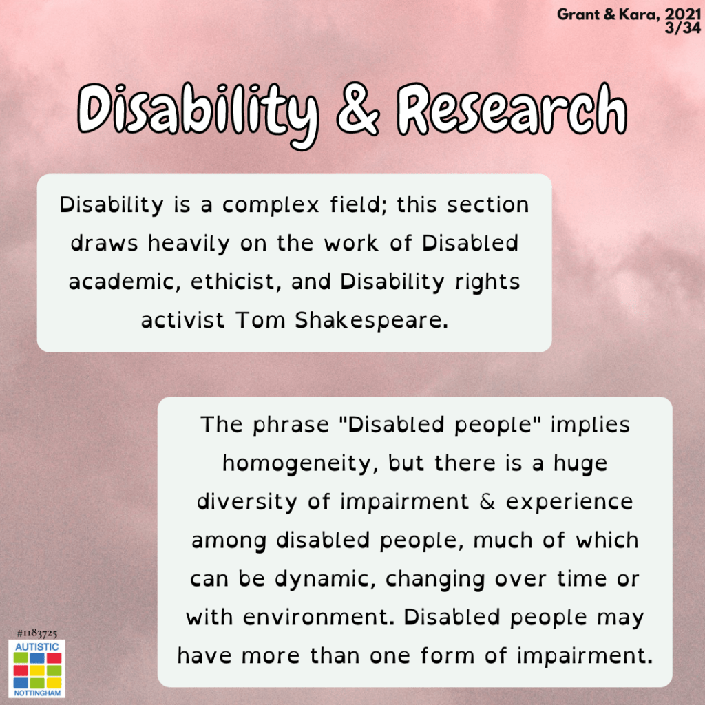 Disability is a complex field; this section draws heavily on the work of Disabled academic, ethicist, and Disability rights activist Tom Shakespeare.