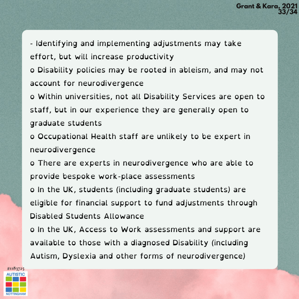 o In the UK, Access to Work assessments and support are available to those with a diagnosed Disability (including Autism, Dyslexia and other forms of neurodivergence)