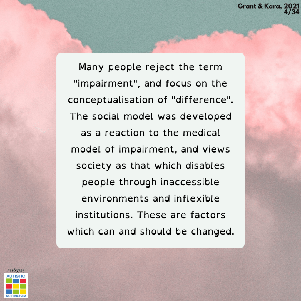 Many people reject the term “impairment”, and focus on the conceptualisation of “difference”. The social model was developed as a reaction to the medical model of impairment, and views society as that which disables people through inaccessible environments and inflexible institutions. These are factors which can and should be changed.