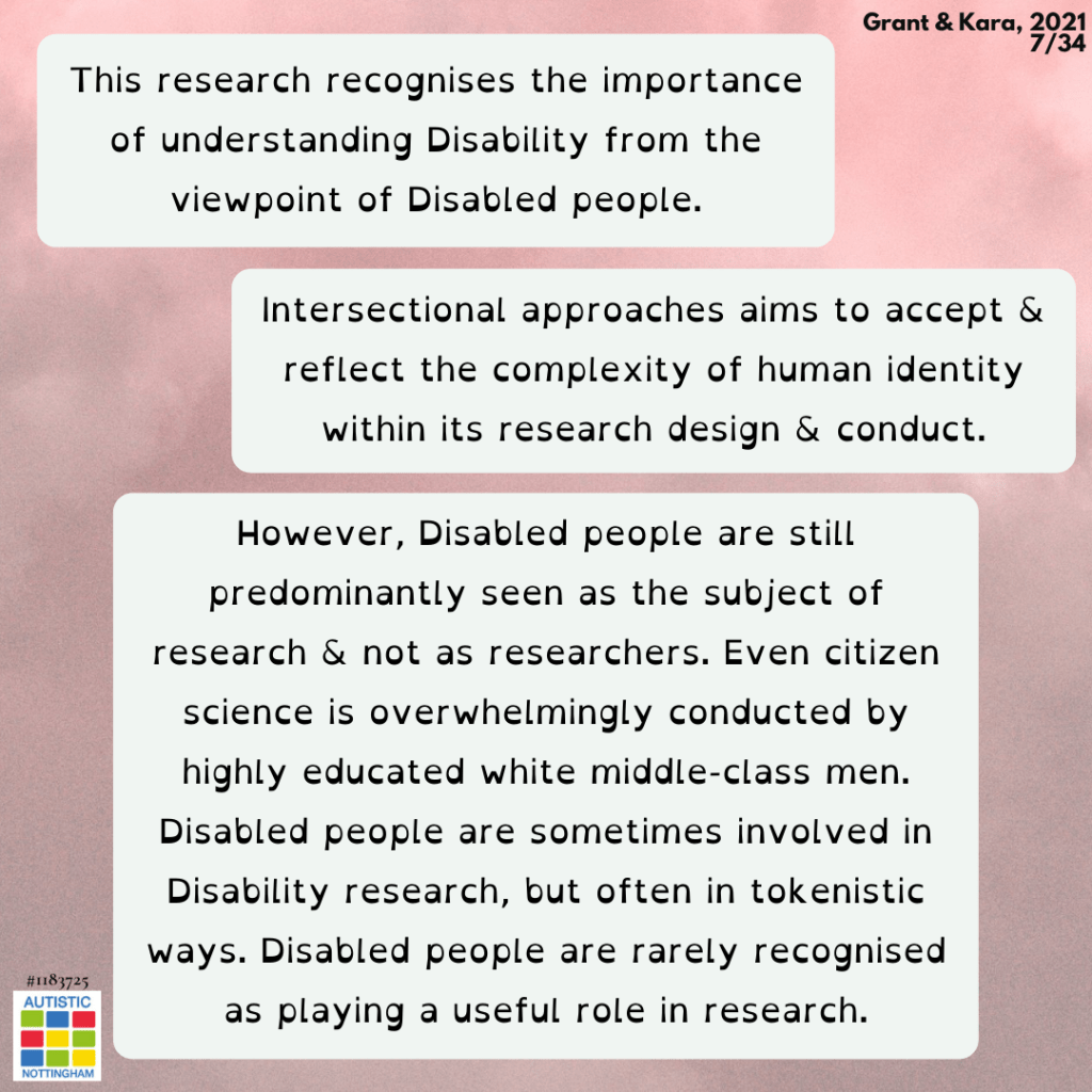 However, Disabled people are still predominantly seen as the subject of research & not as researchers. Even citizen science is overwhelmingly conducted by highly educated white middle-class men. Disabled people are sometimes involved in Disability research, but often in tokenistic ways. Disabled people are rarely recognised as playing a useful role in research.