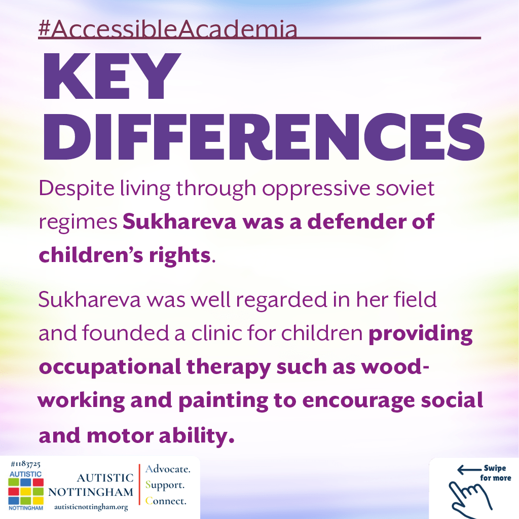 Sukhareva was well regarded in her field and founded a clinic for children providing occupational therapy such as wood-working and painting to encourage social and motor ability.